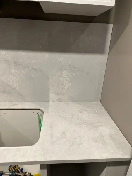 例如上圖所示,檯面雖然來自同一片石英石大板,卻因拼接方式不同而出現深淺差異。
