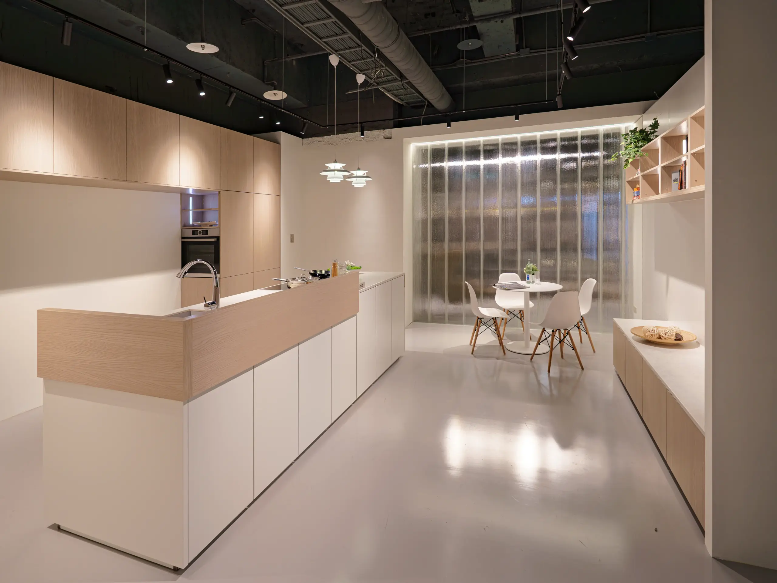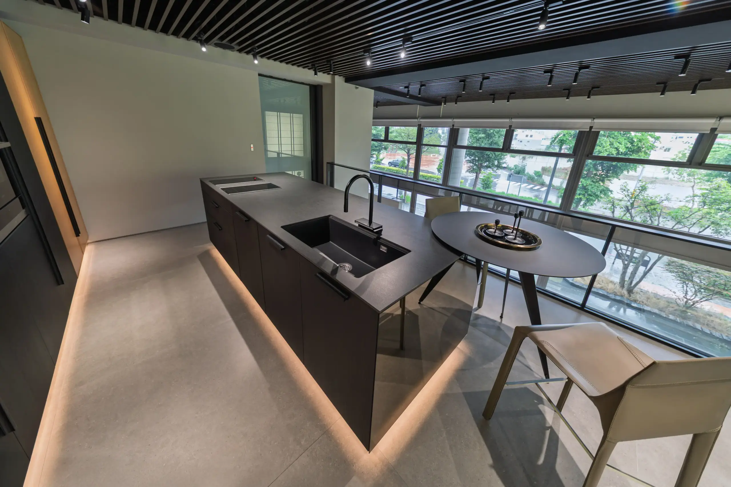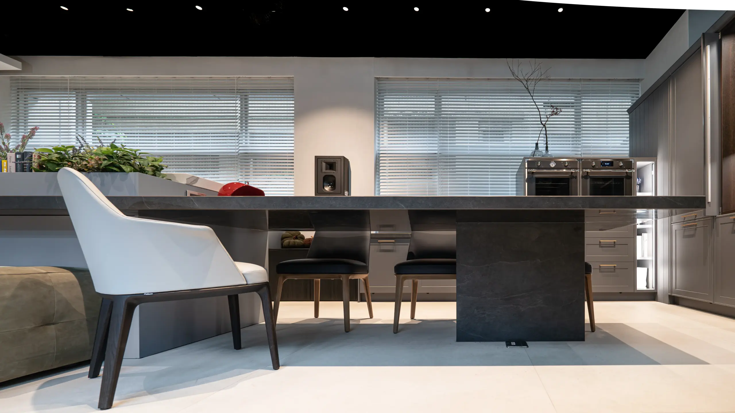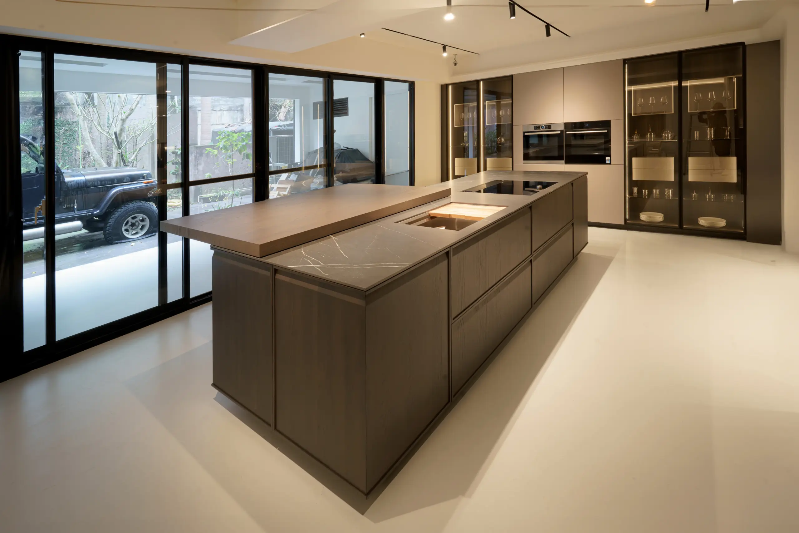 門市展間由呈勖使用義大利LEVEL廚房檯面、中島與會議桌