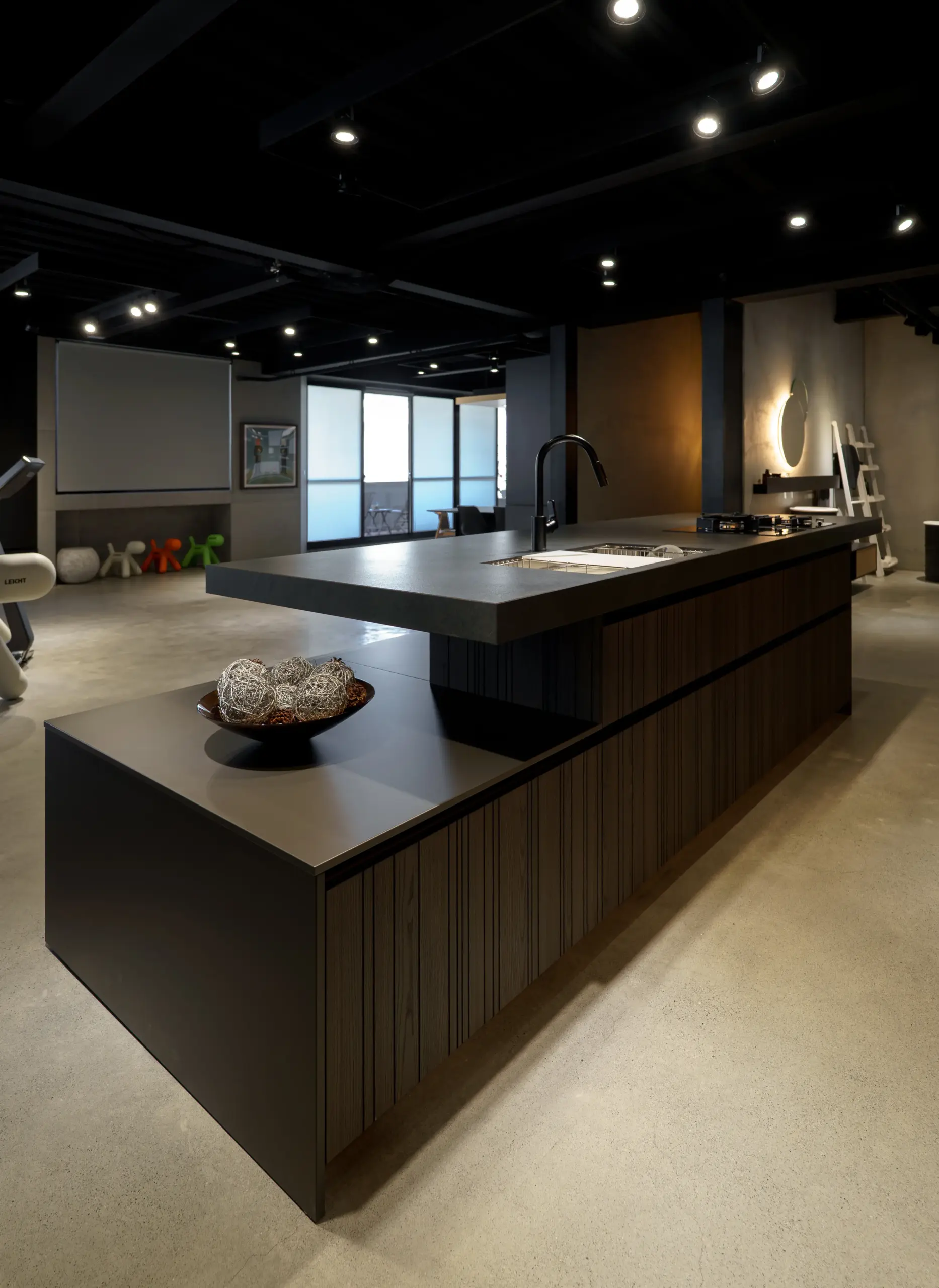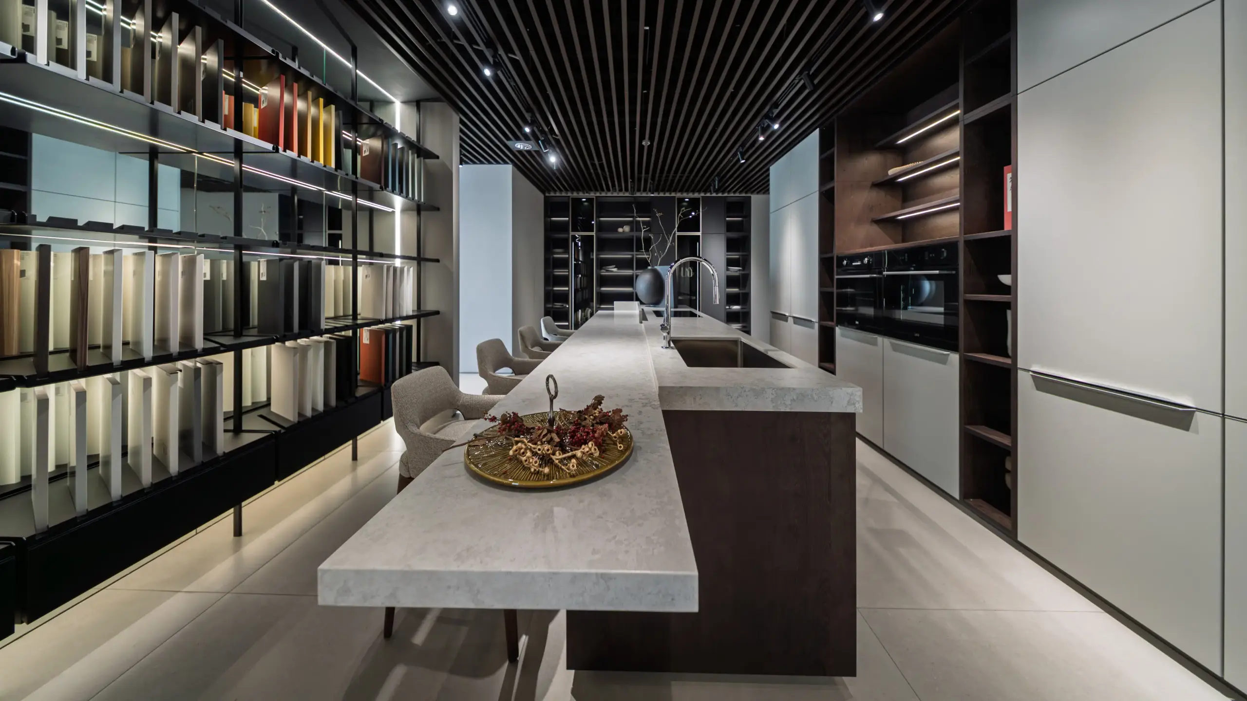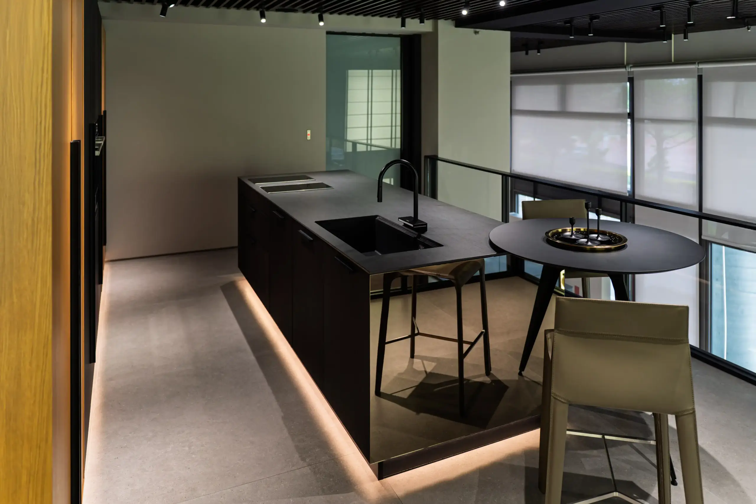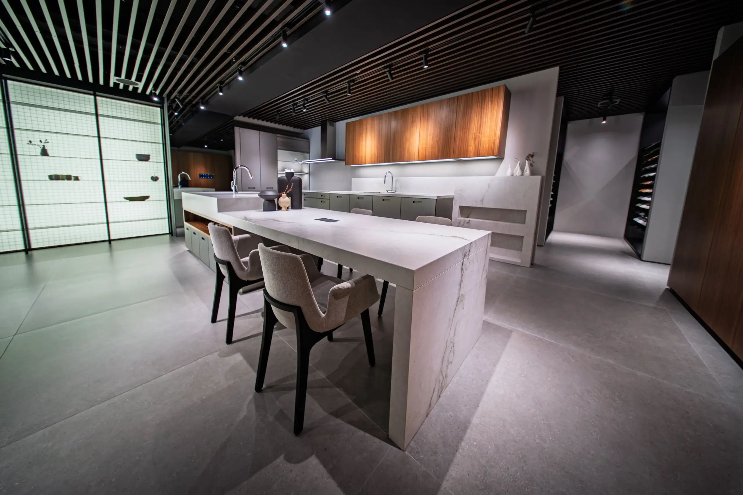 門市展間由呈勖使用義大利LEVEL廚房檯面、中島與會議桌
