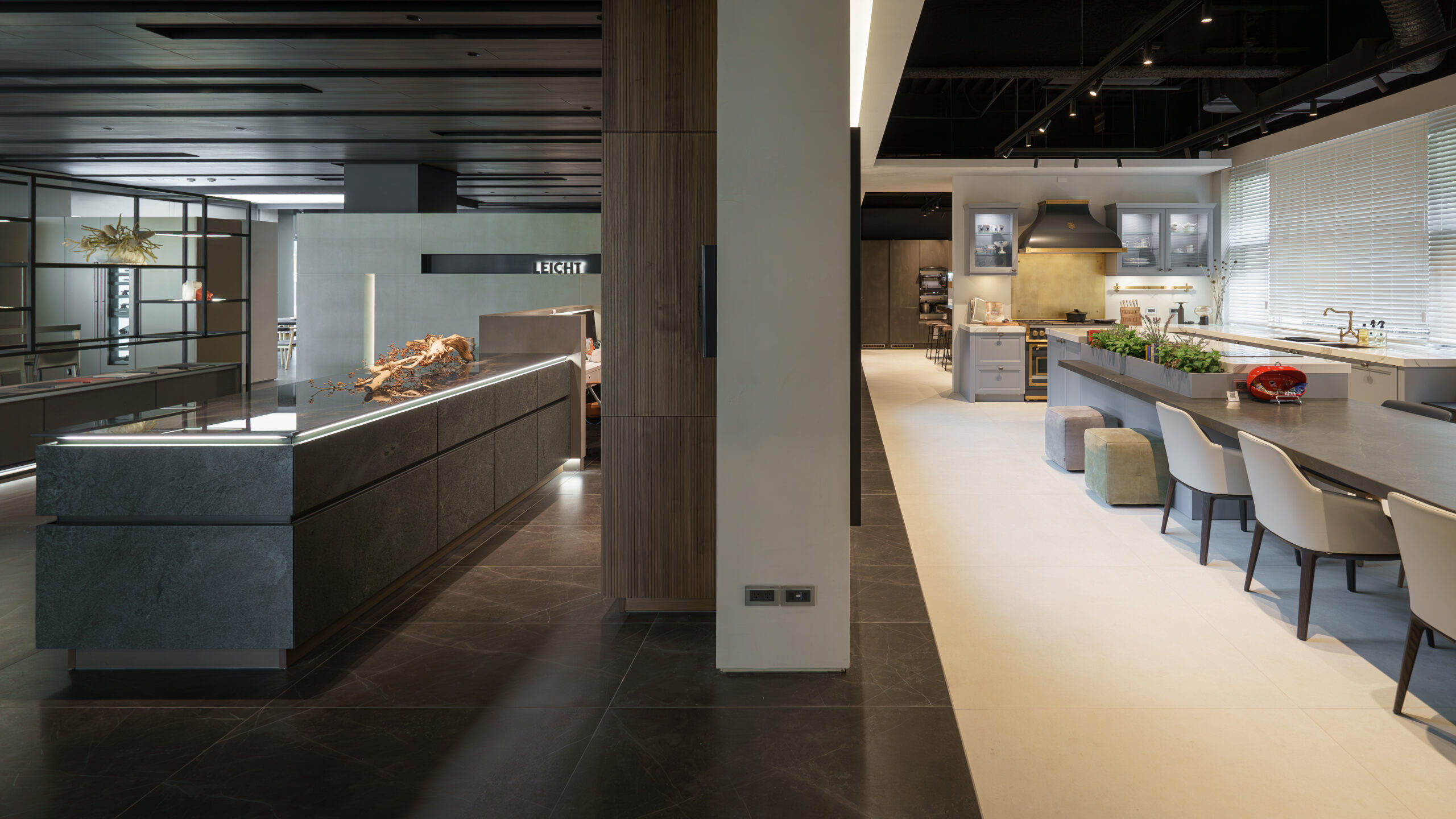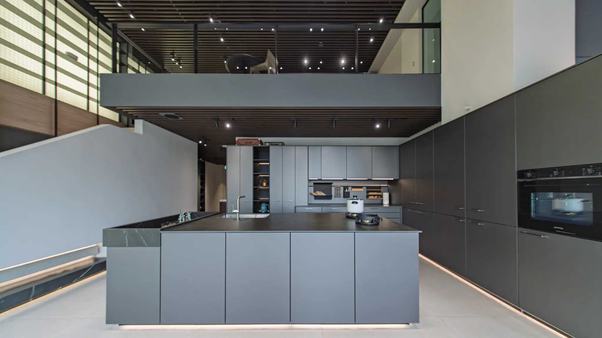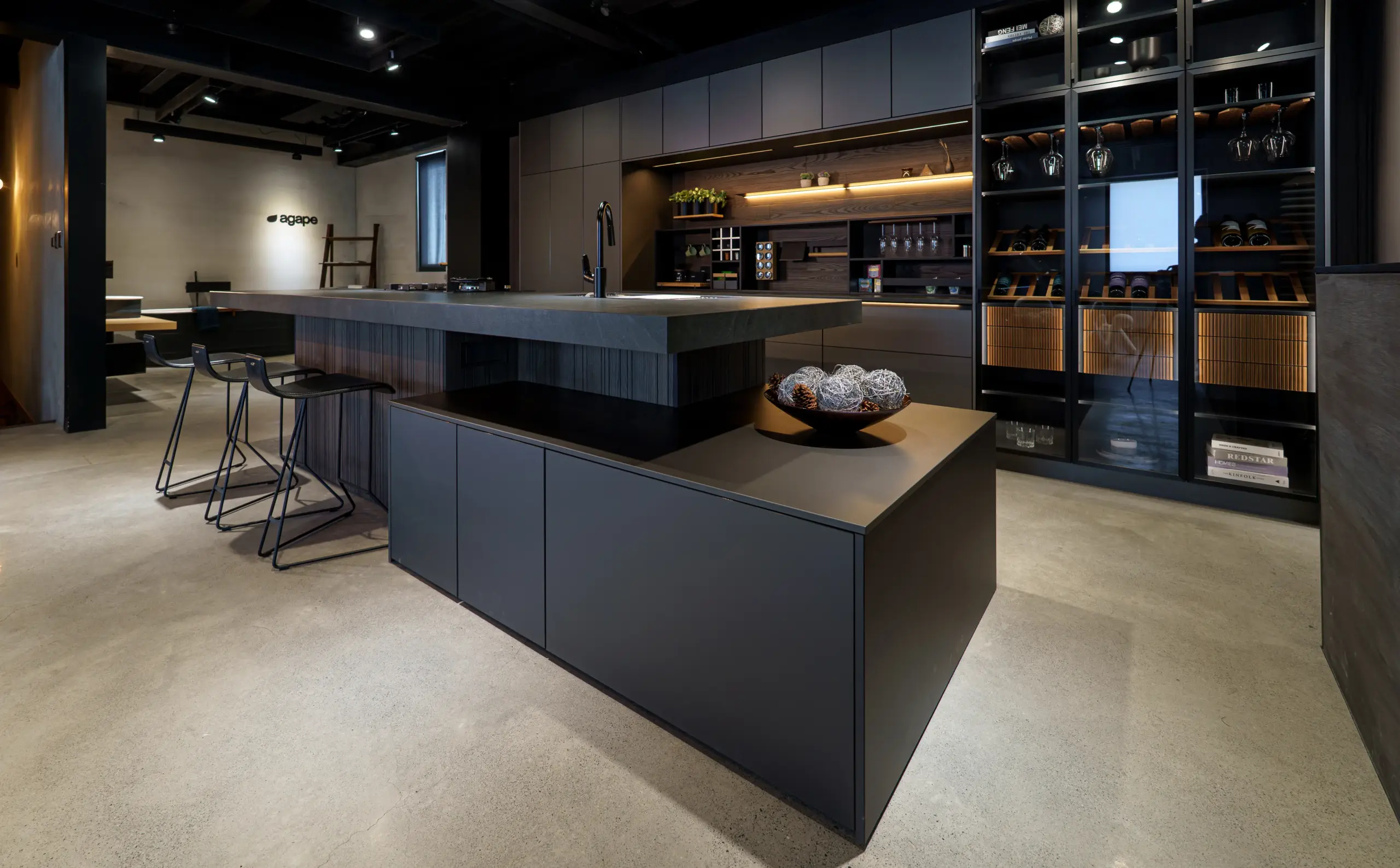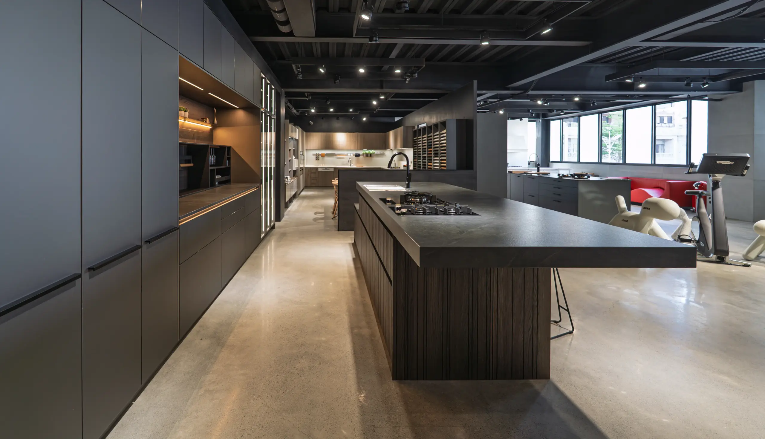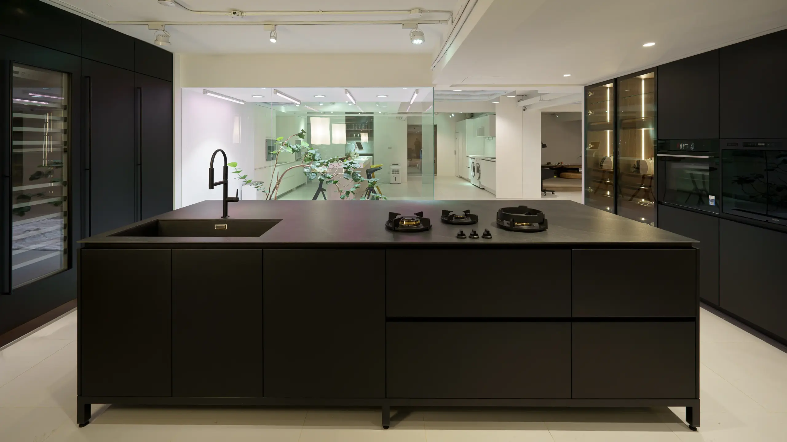 門市展間由呈勖使用義大利LEVEL廚房檯面、中島與會議桌