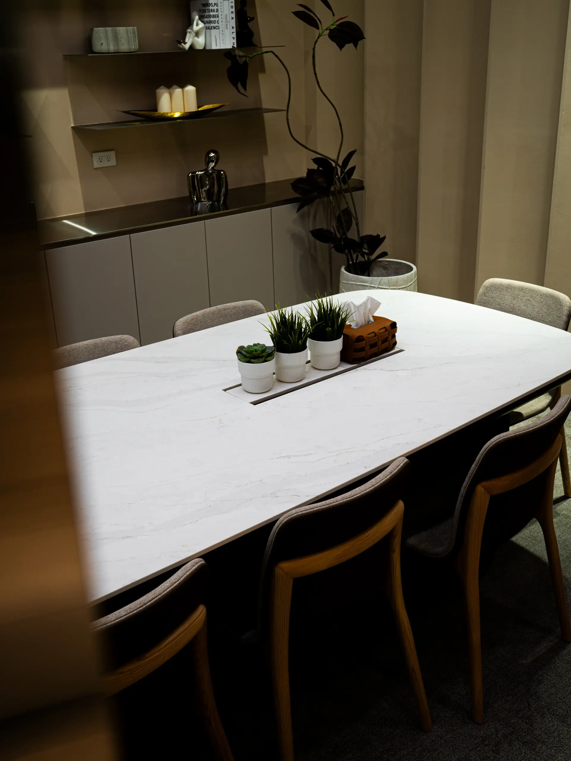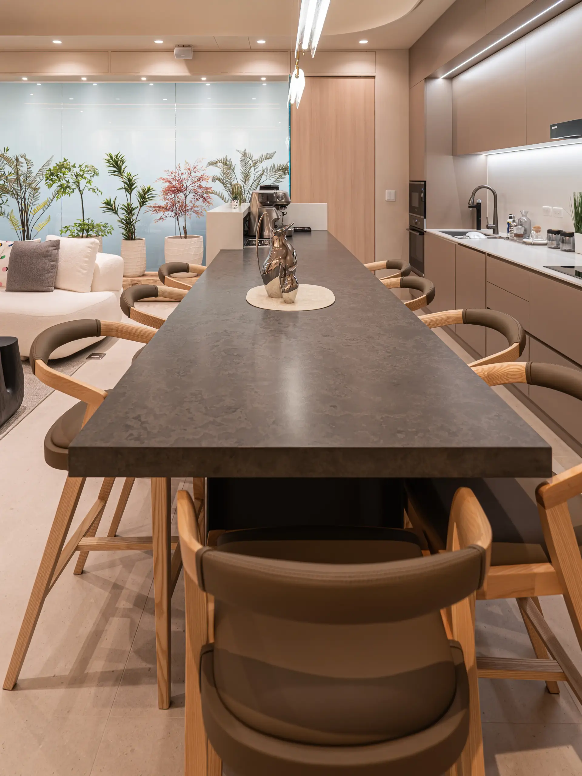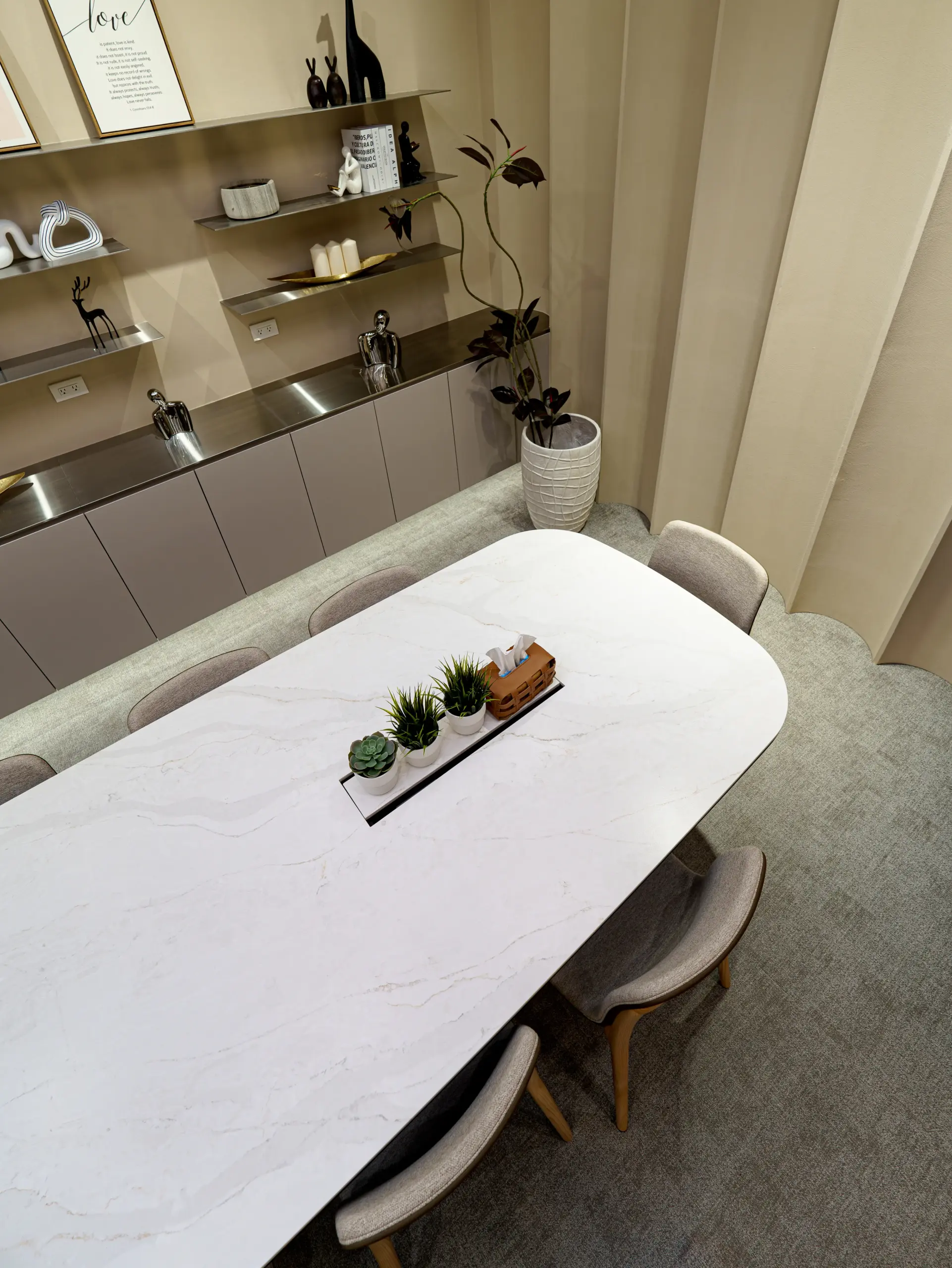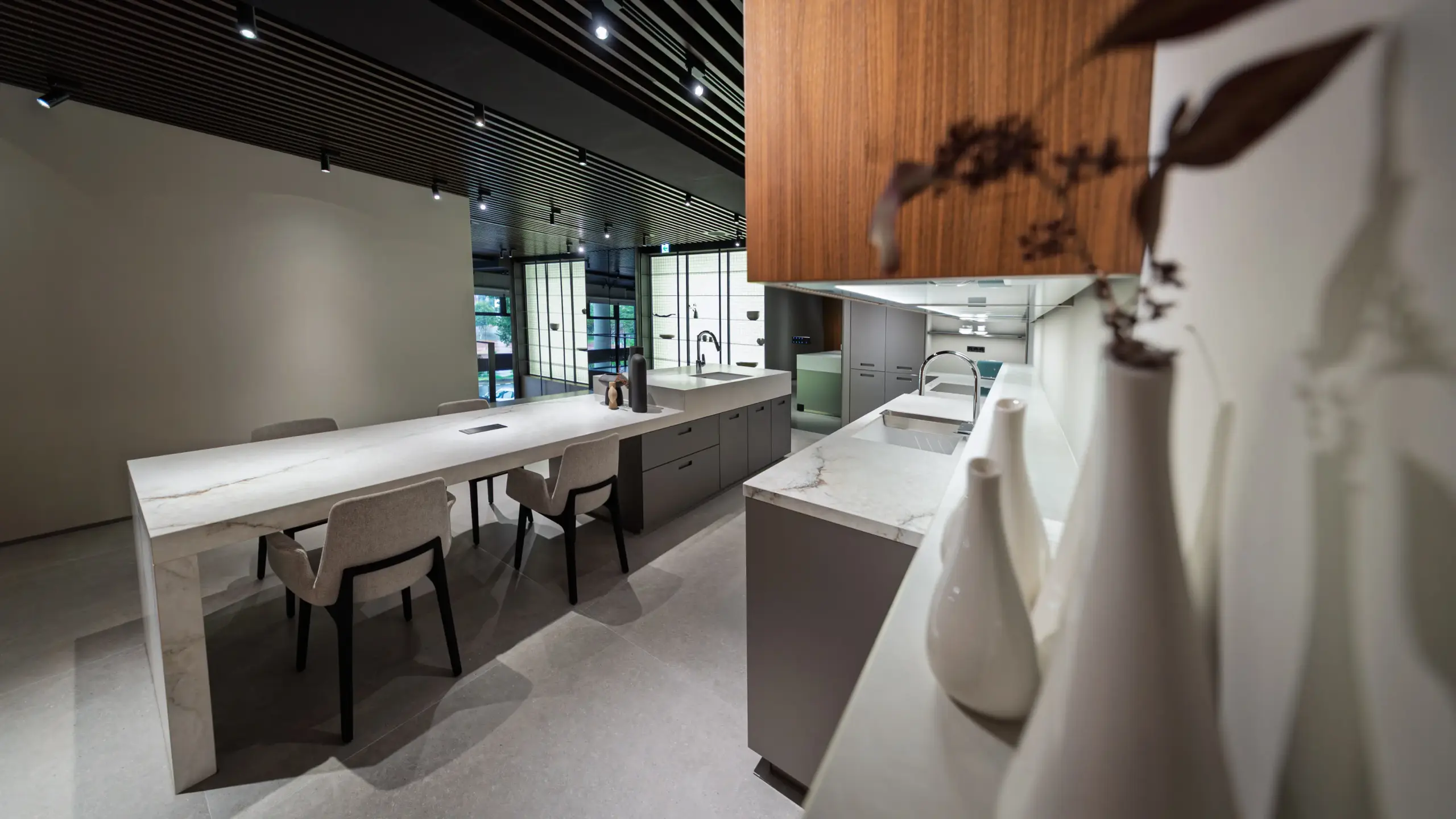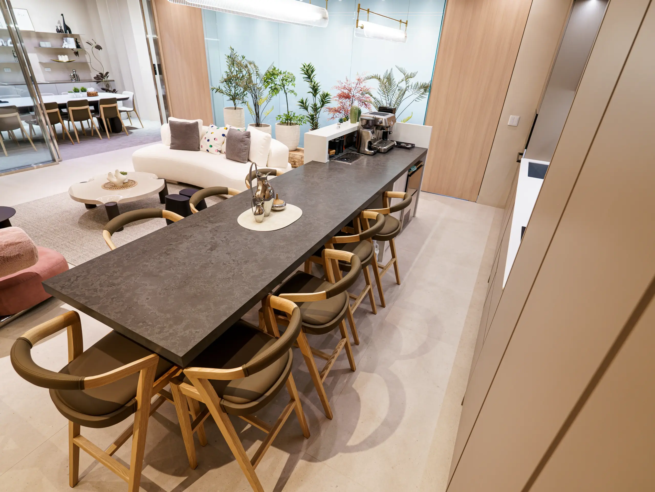 門市展間使用Vicostone會議桌與廚房、中島檯面
