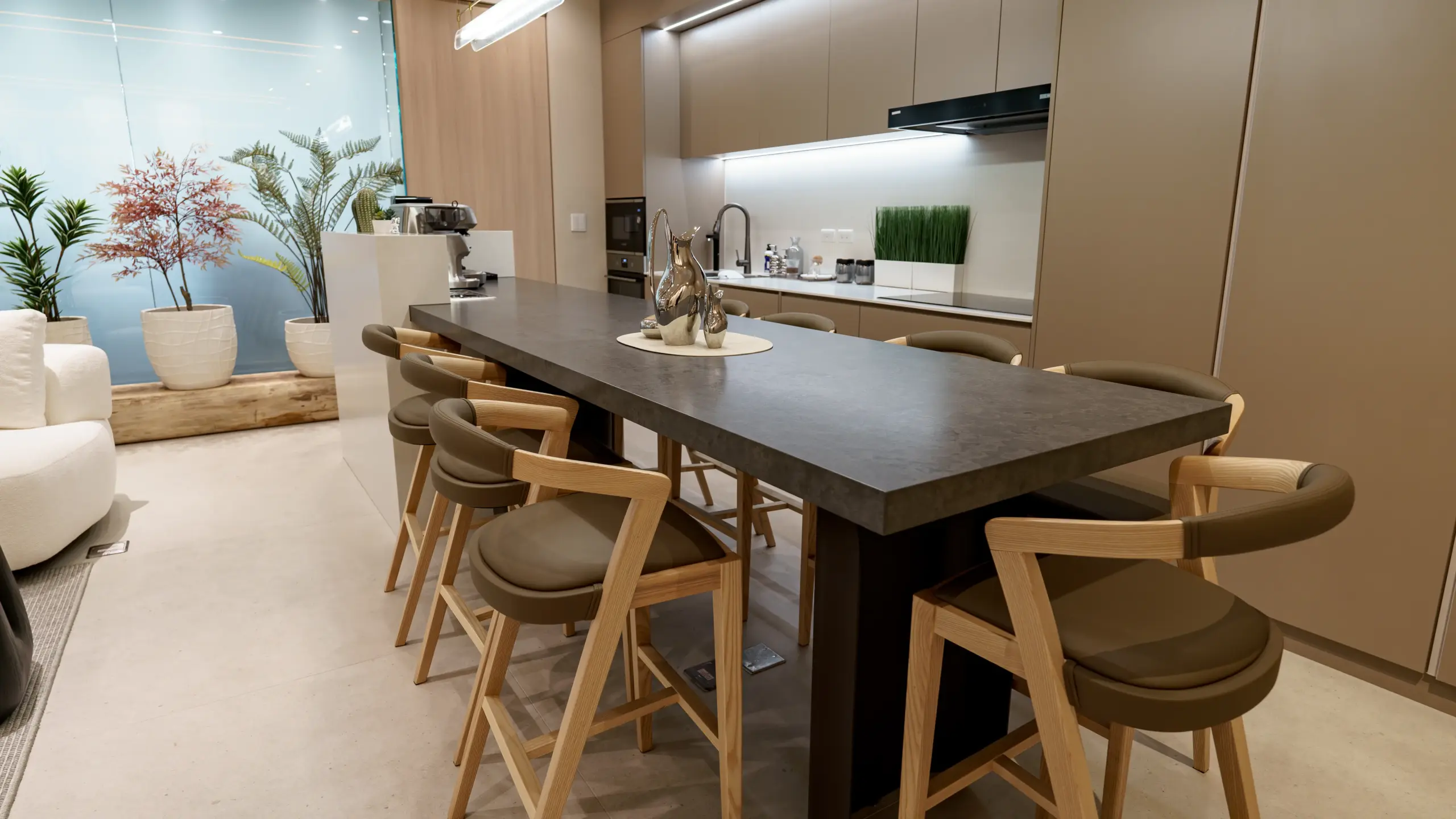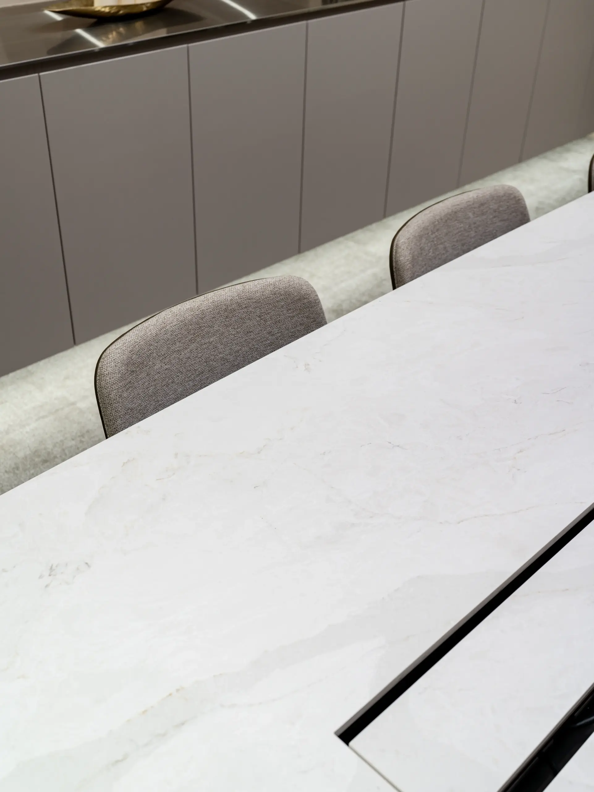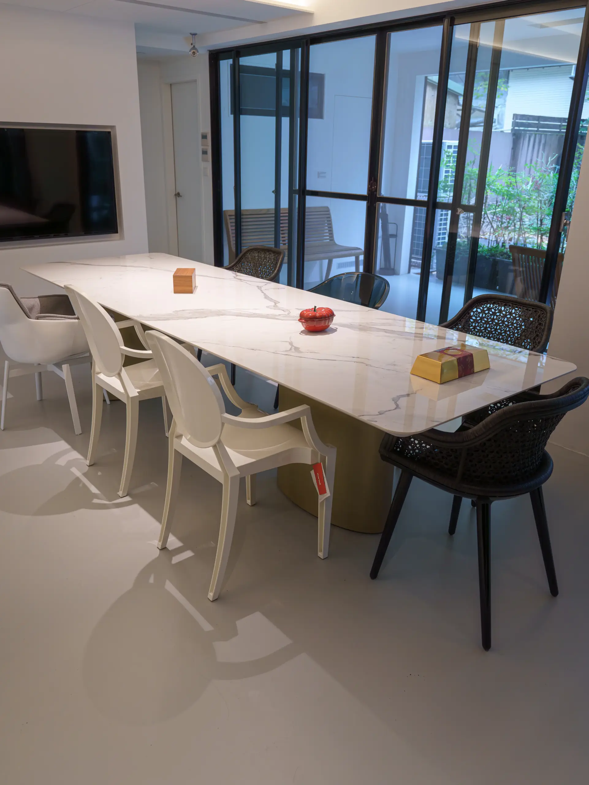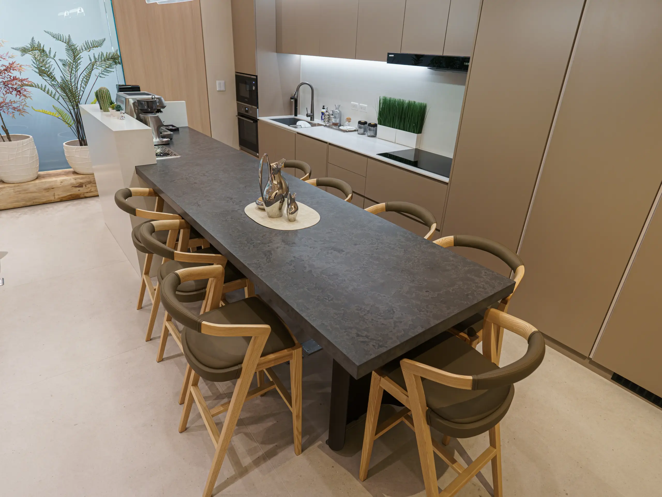 門市展間使用Vicostone會議桌與廚房、中島檯面