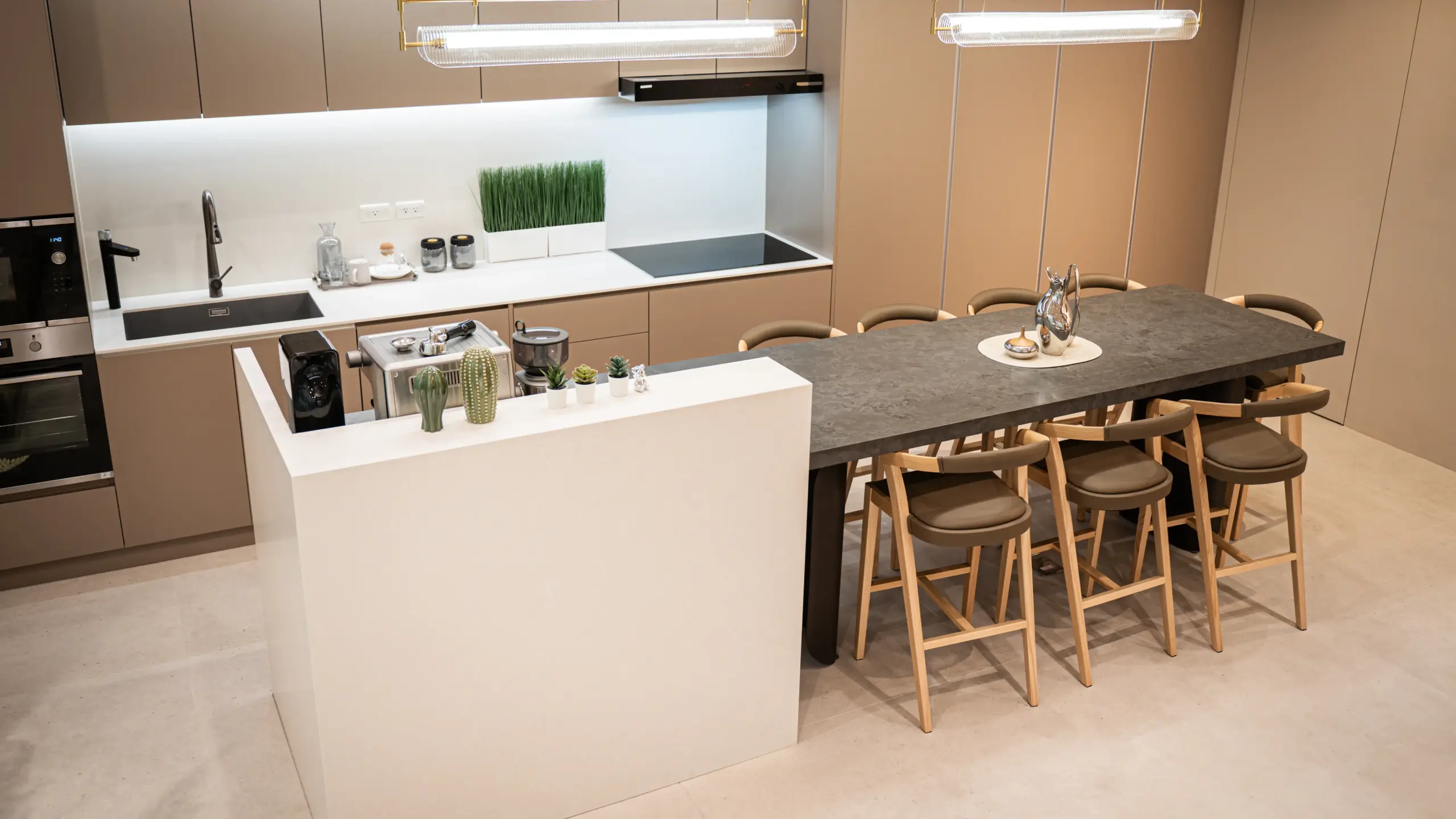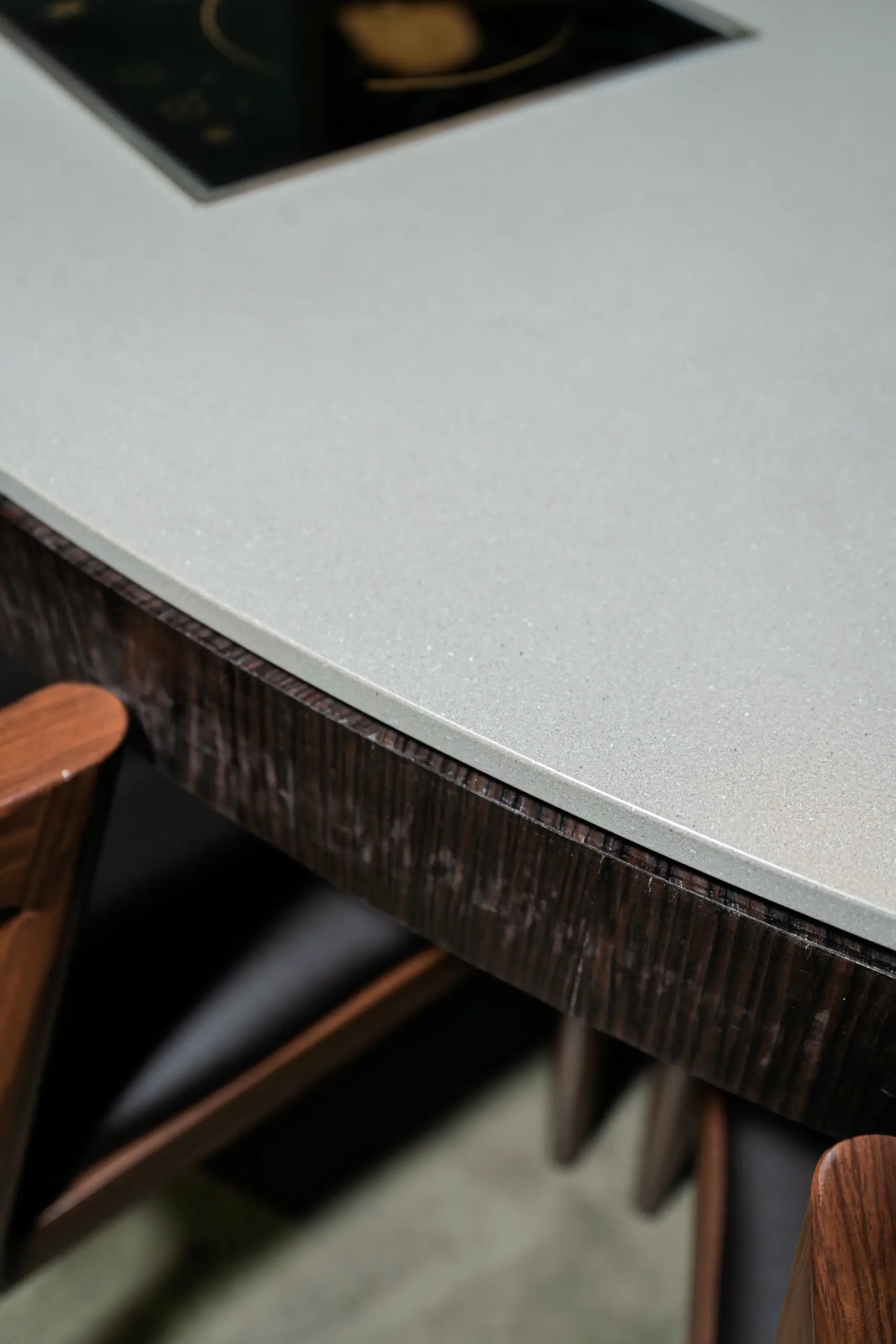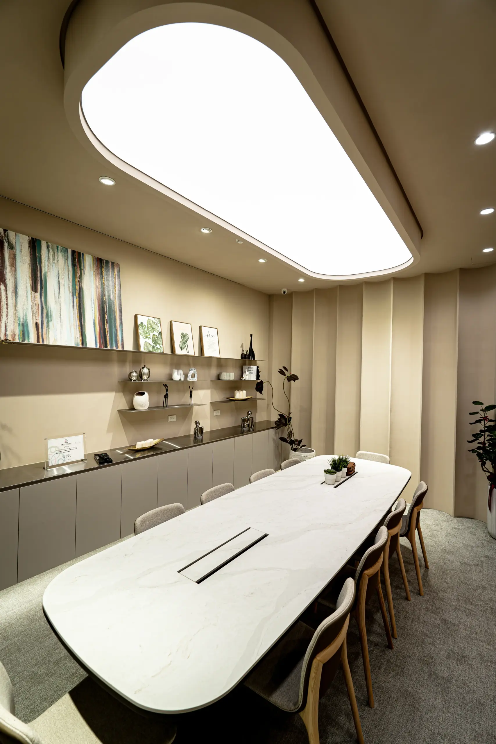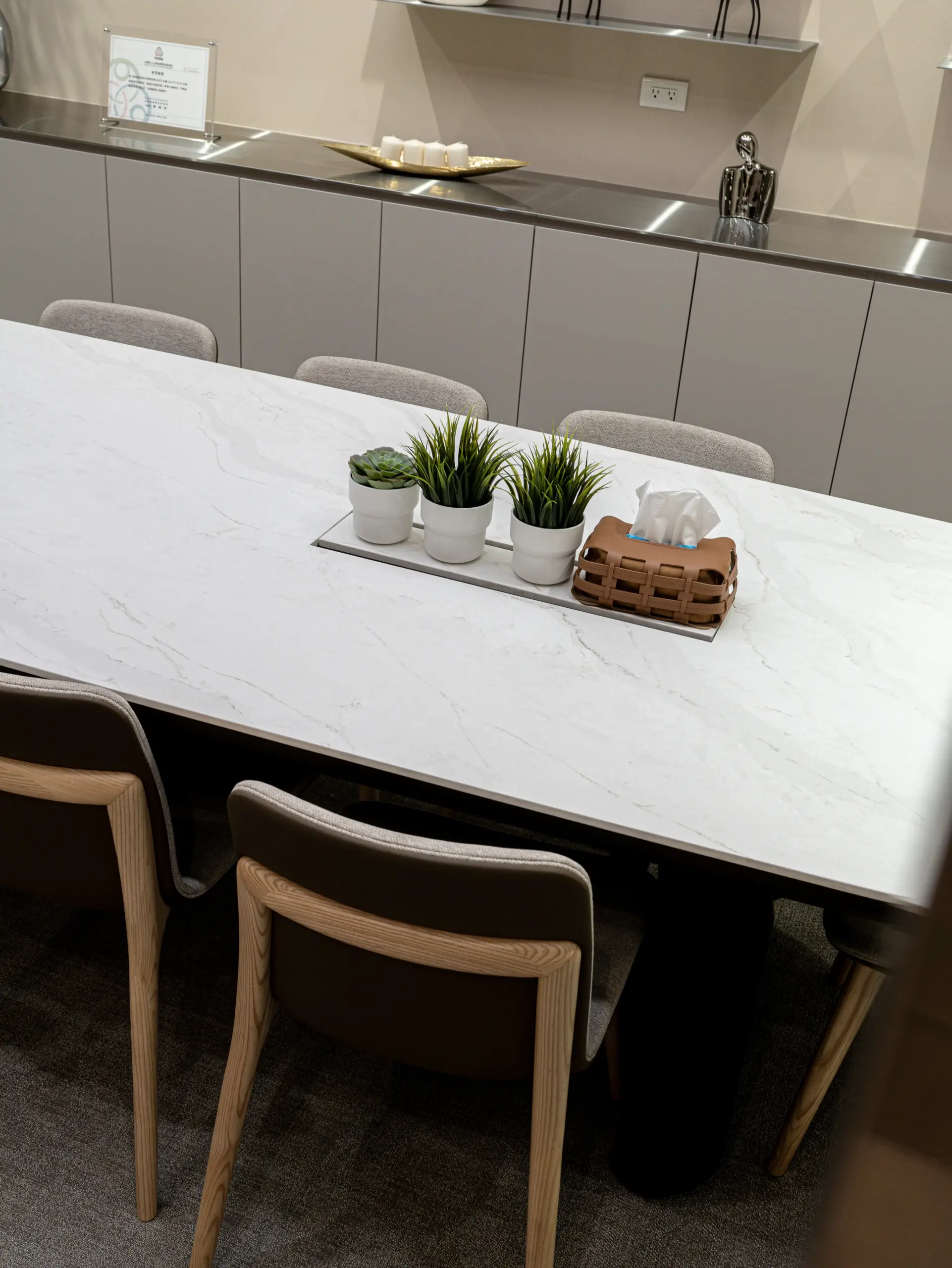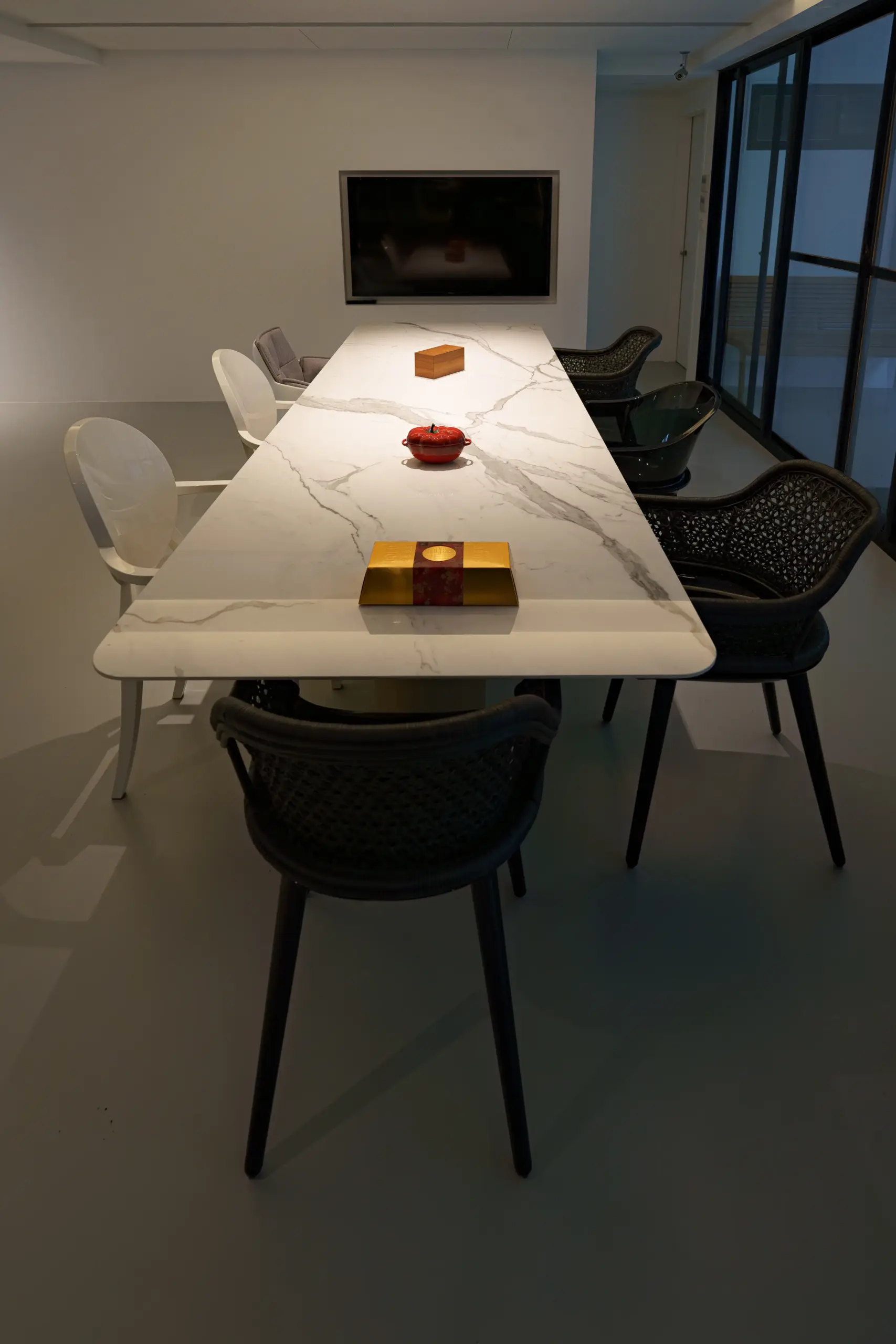 門市展間使用Vicostone會議桌與廚房、中島檯面