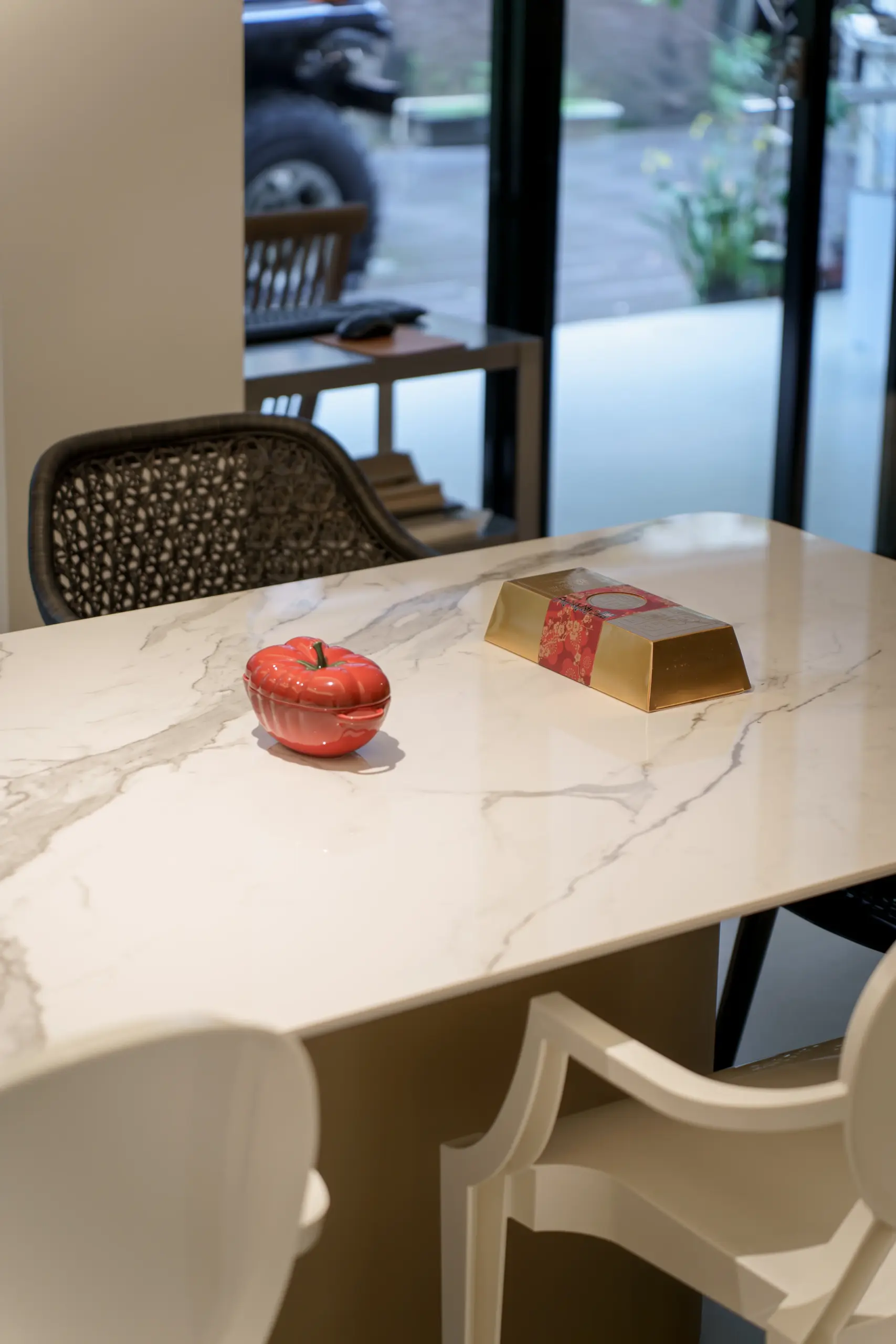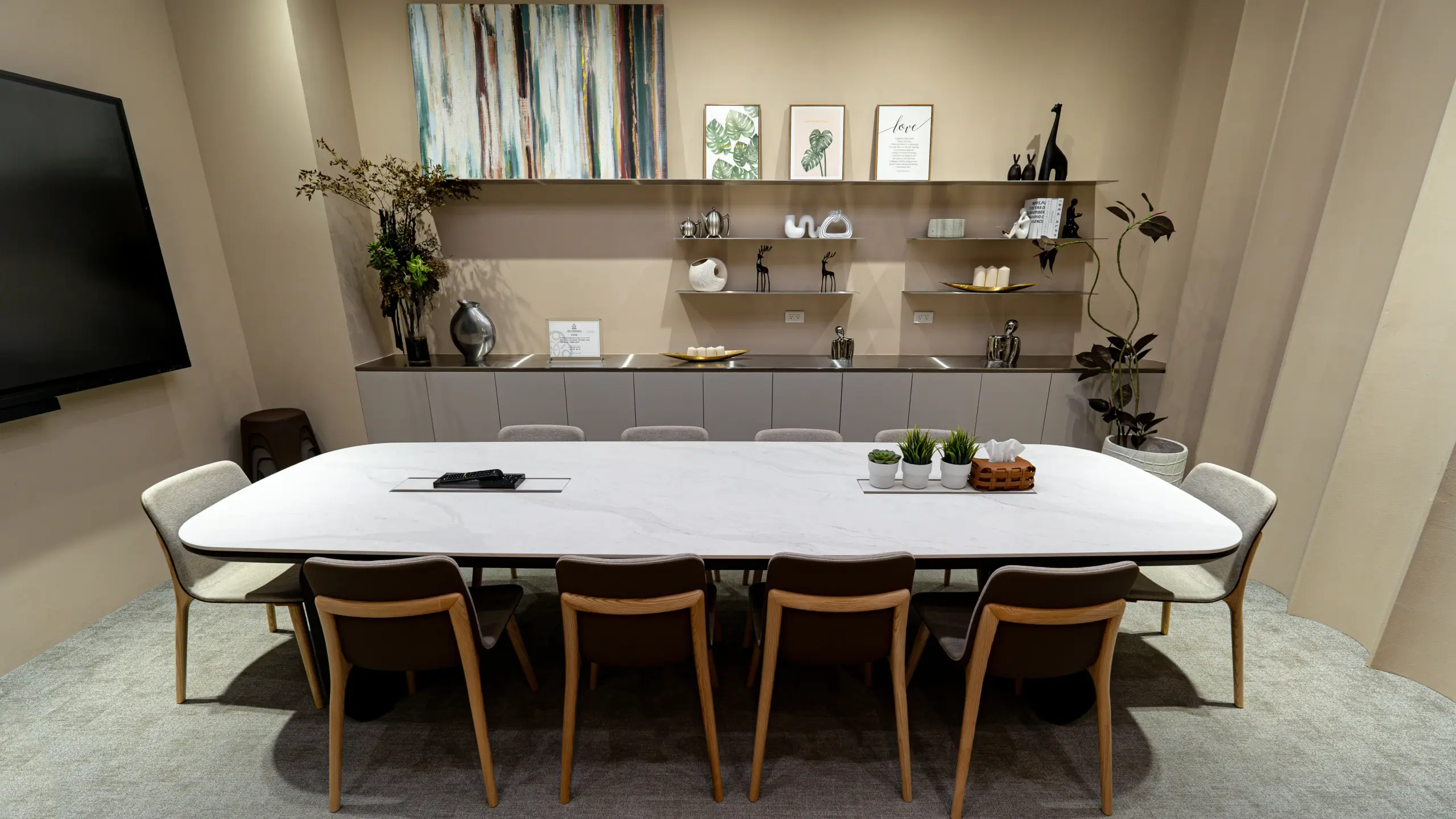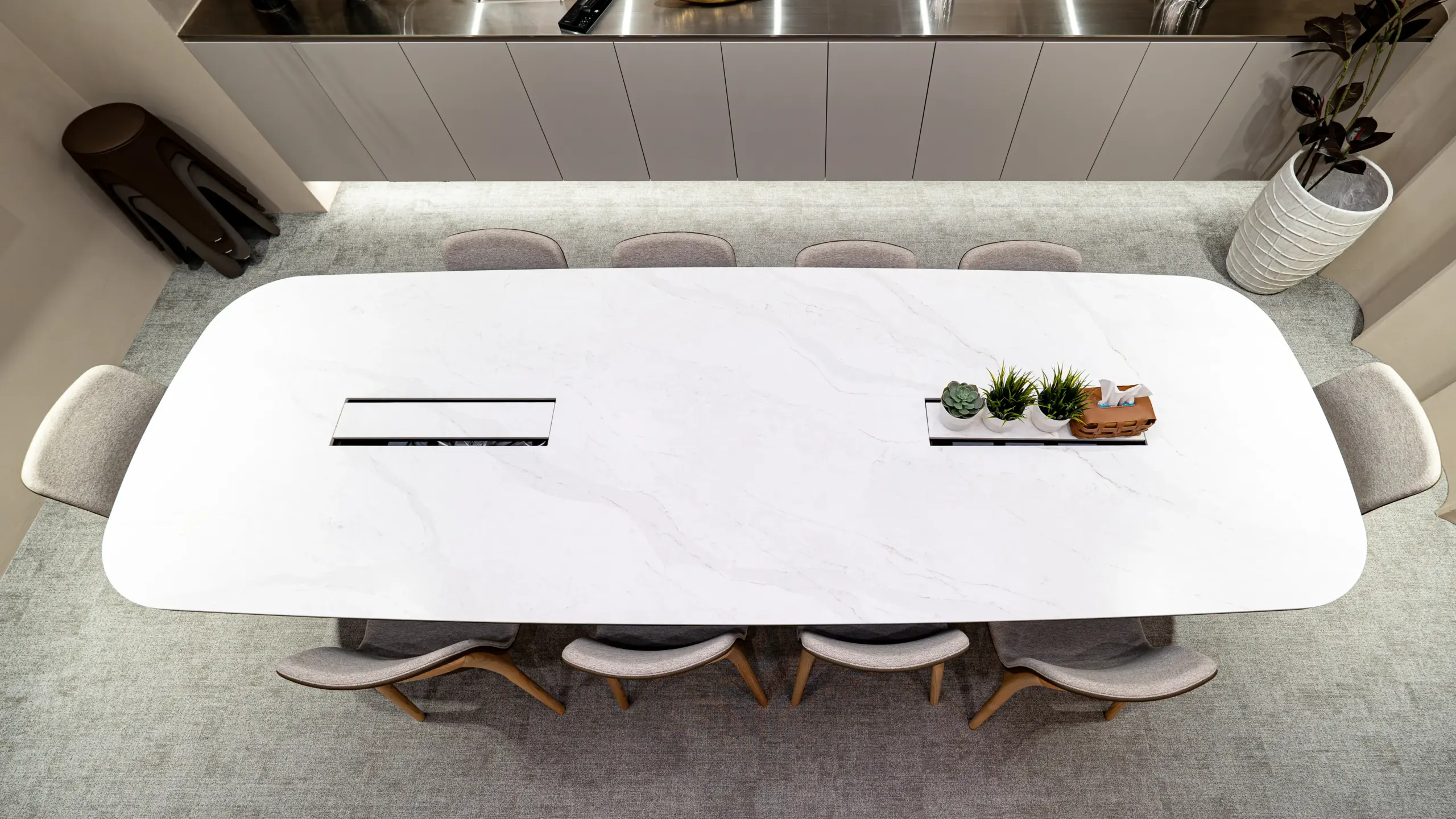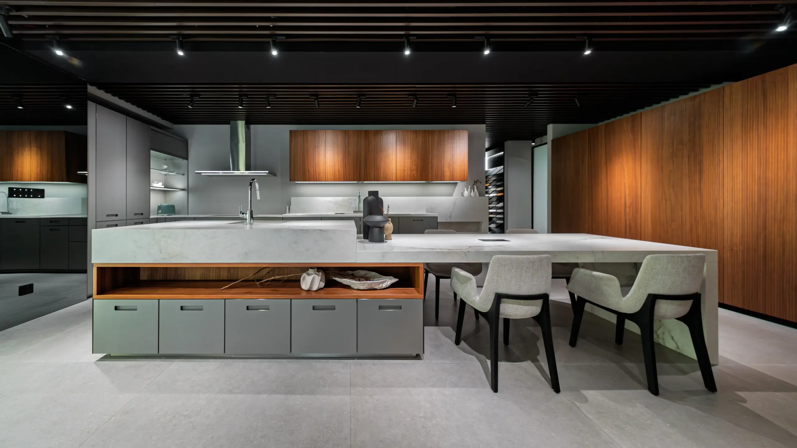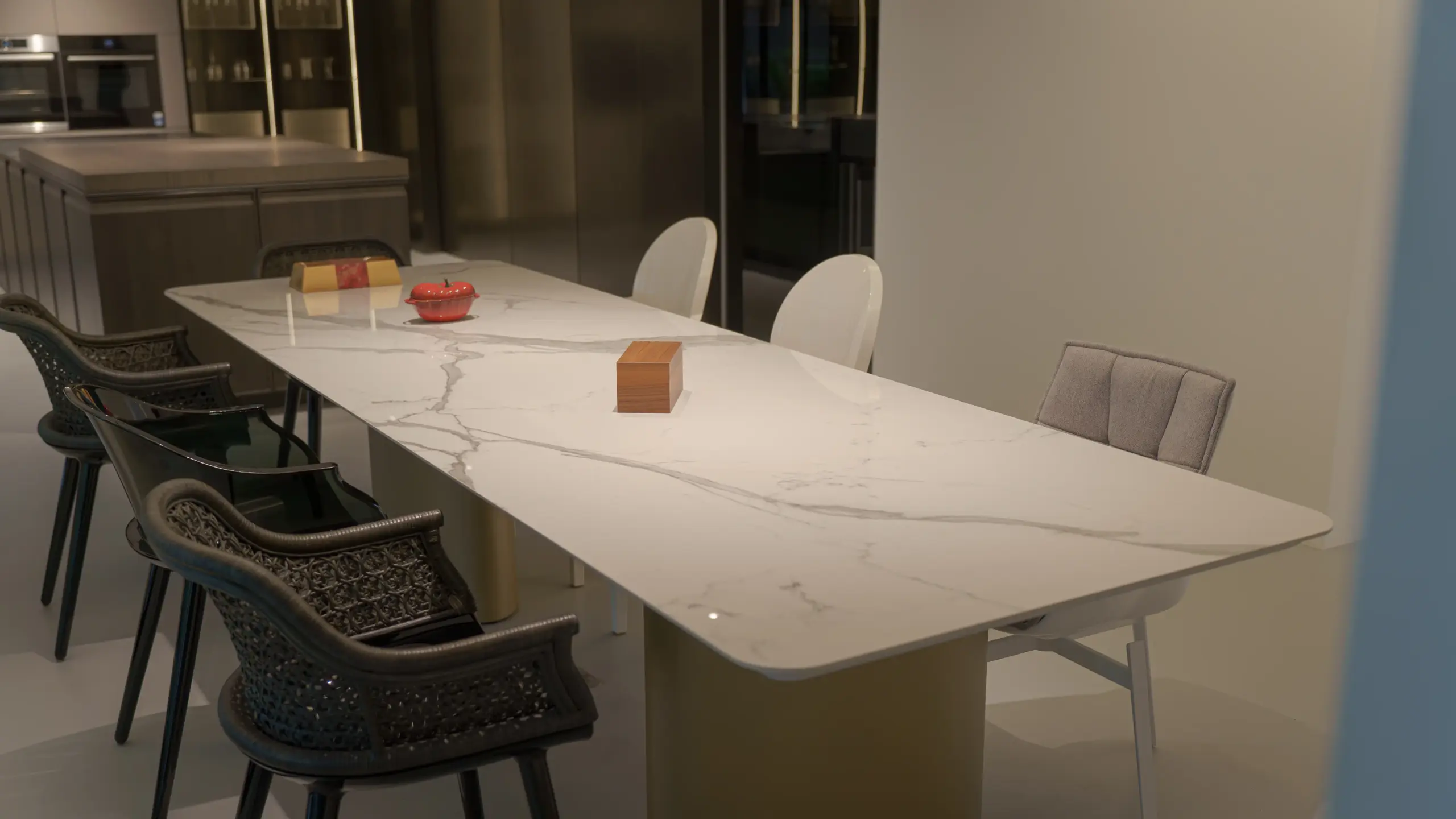 門市展間使用Vicostone會議桌與廚房、中島檯面