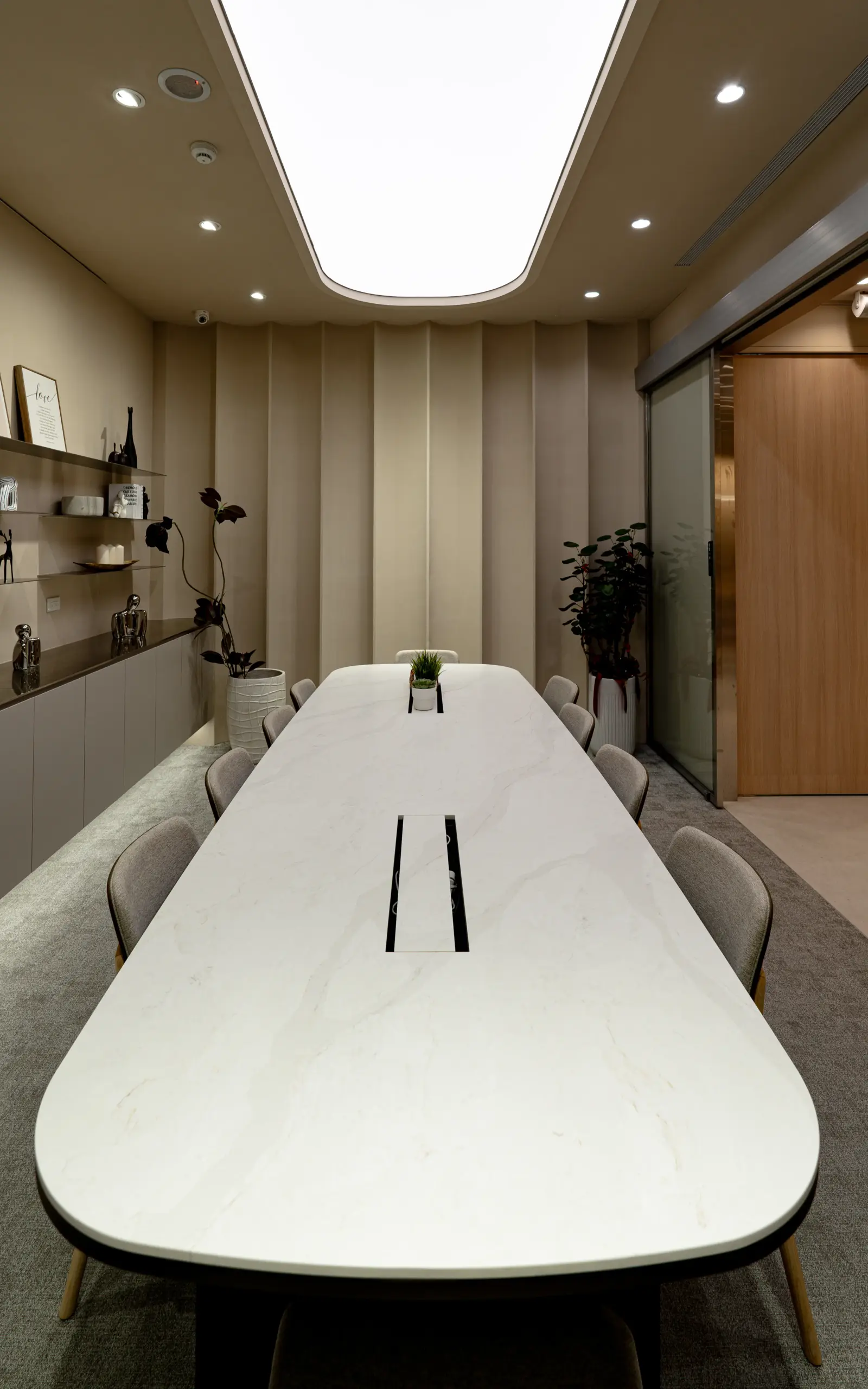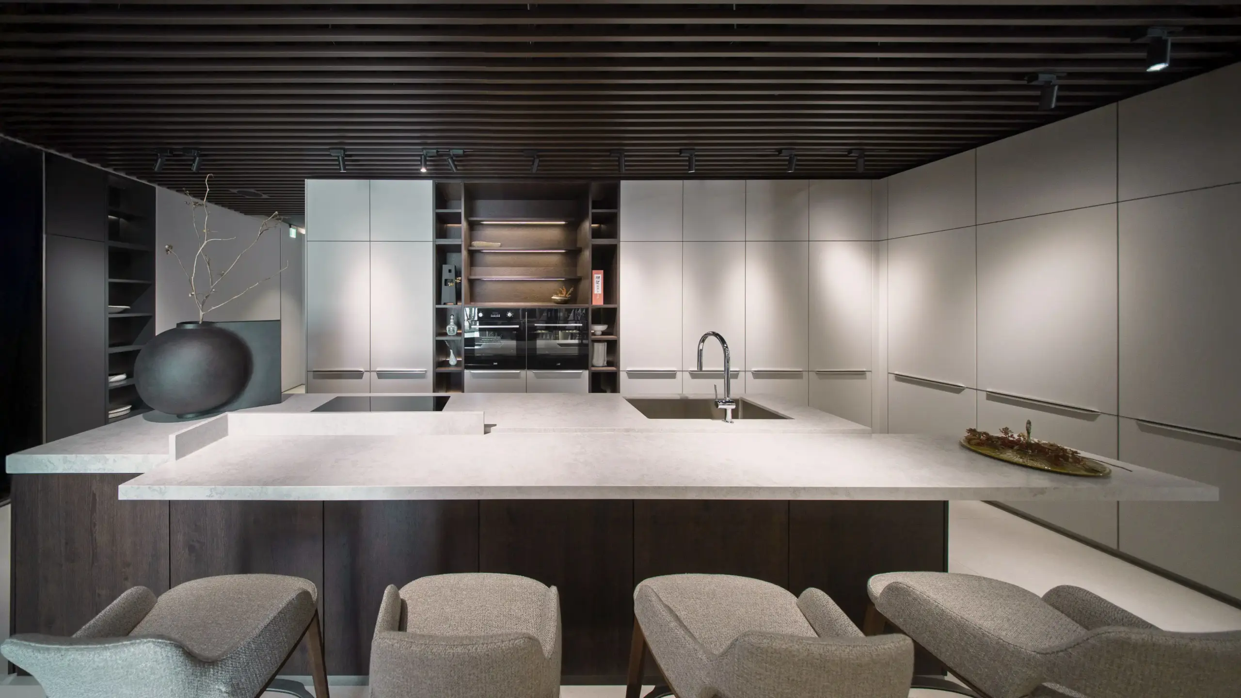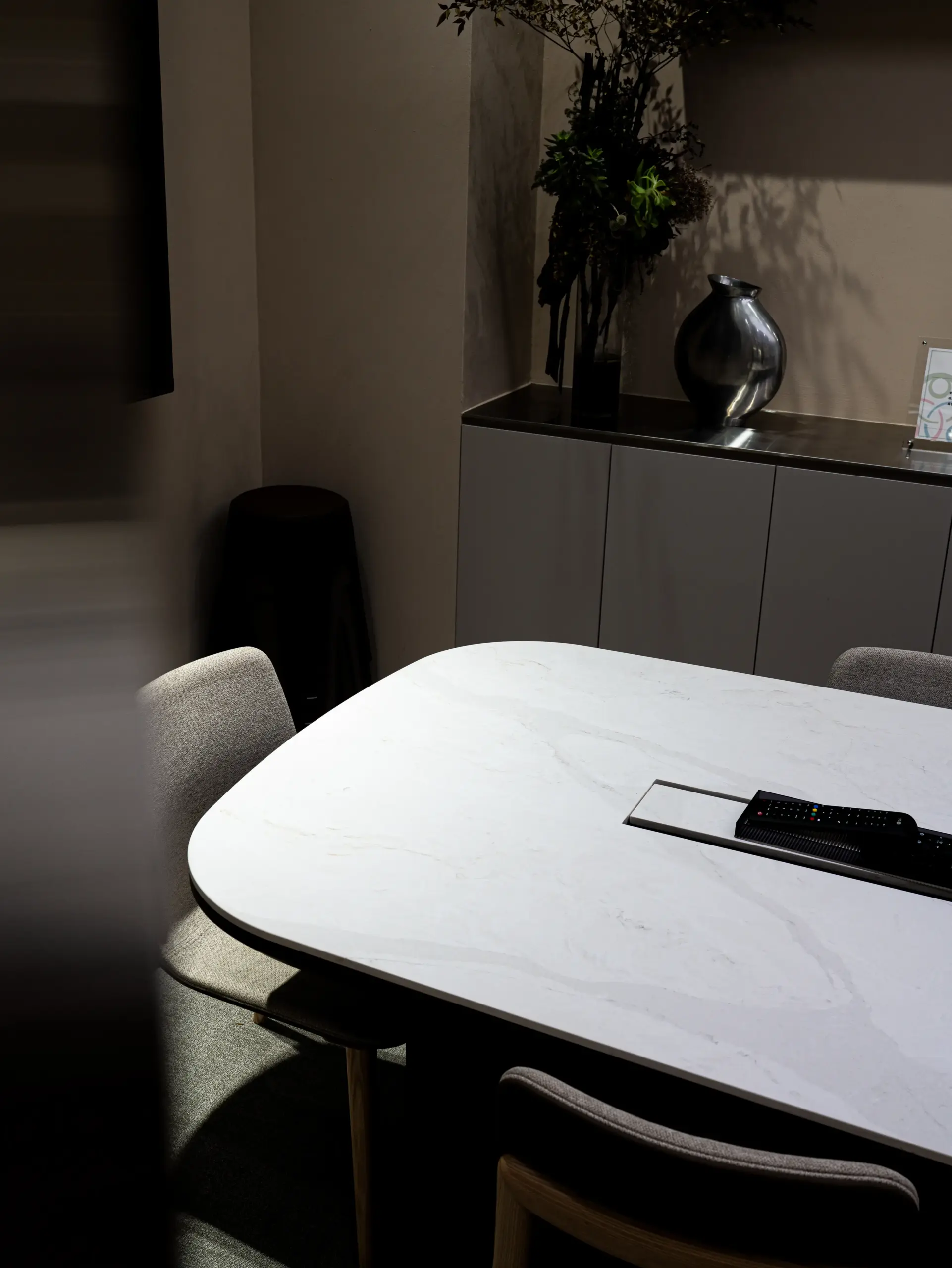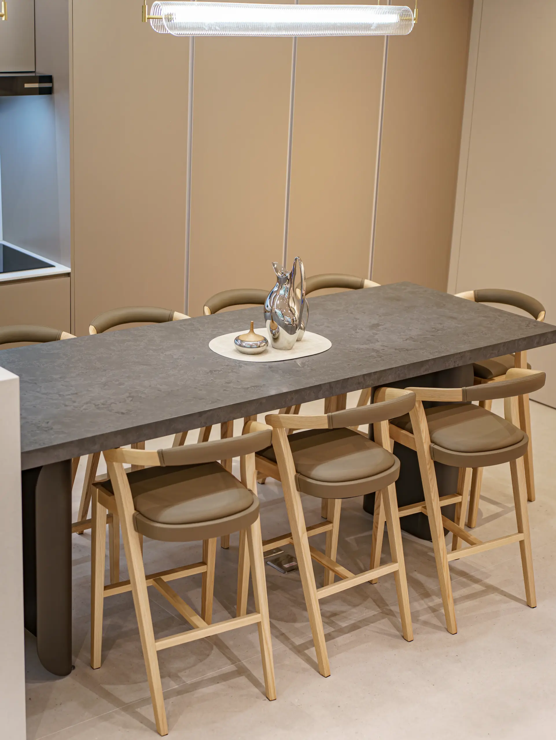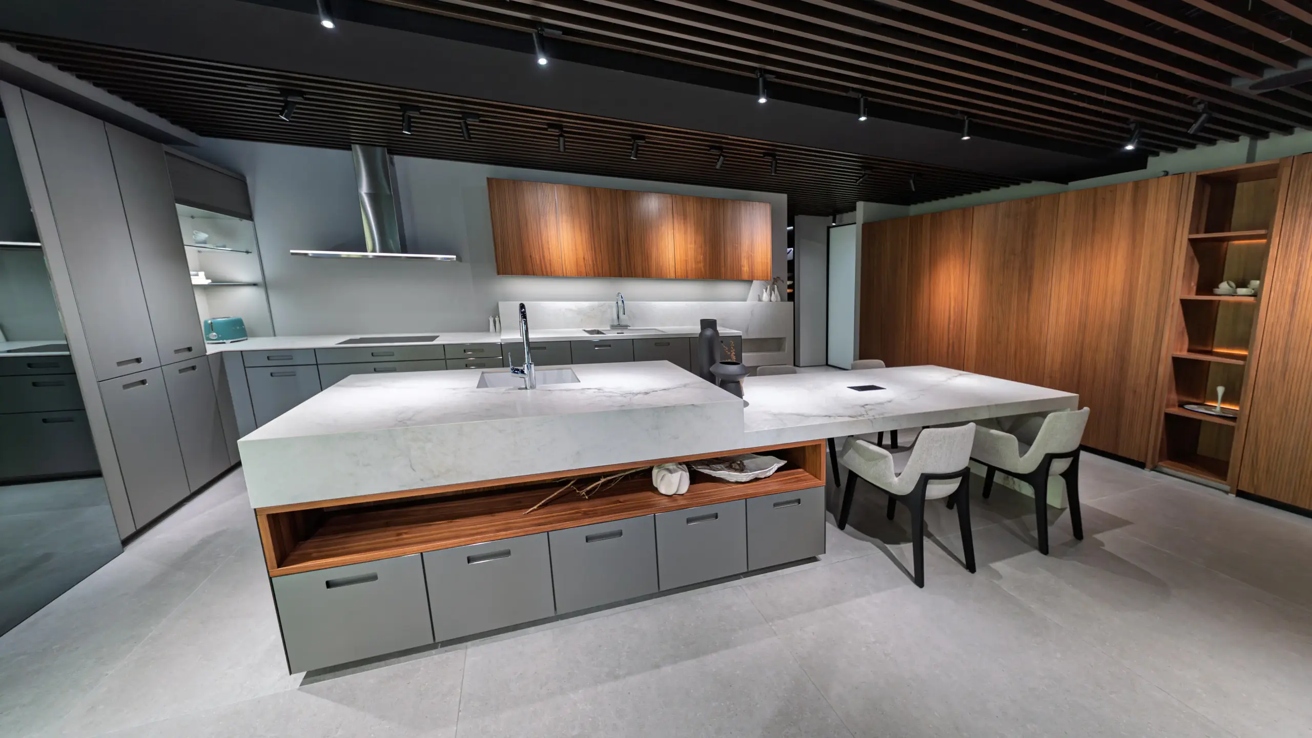 門市展間使用Vicostone會議桌與廚房、中島檯面