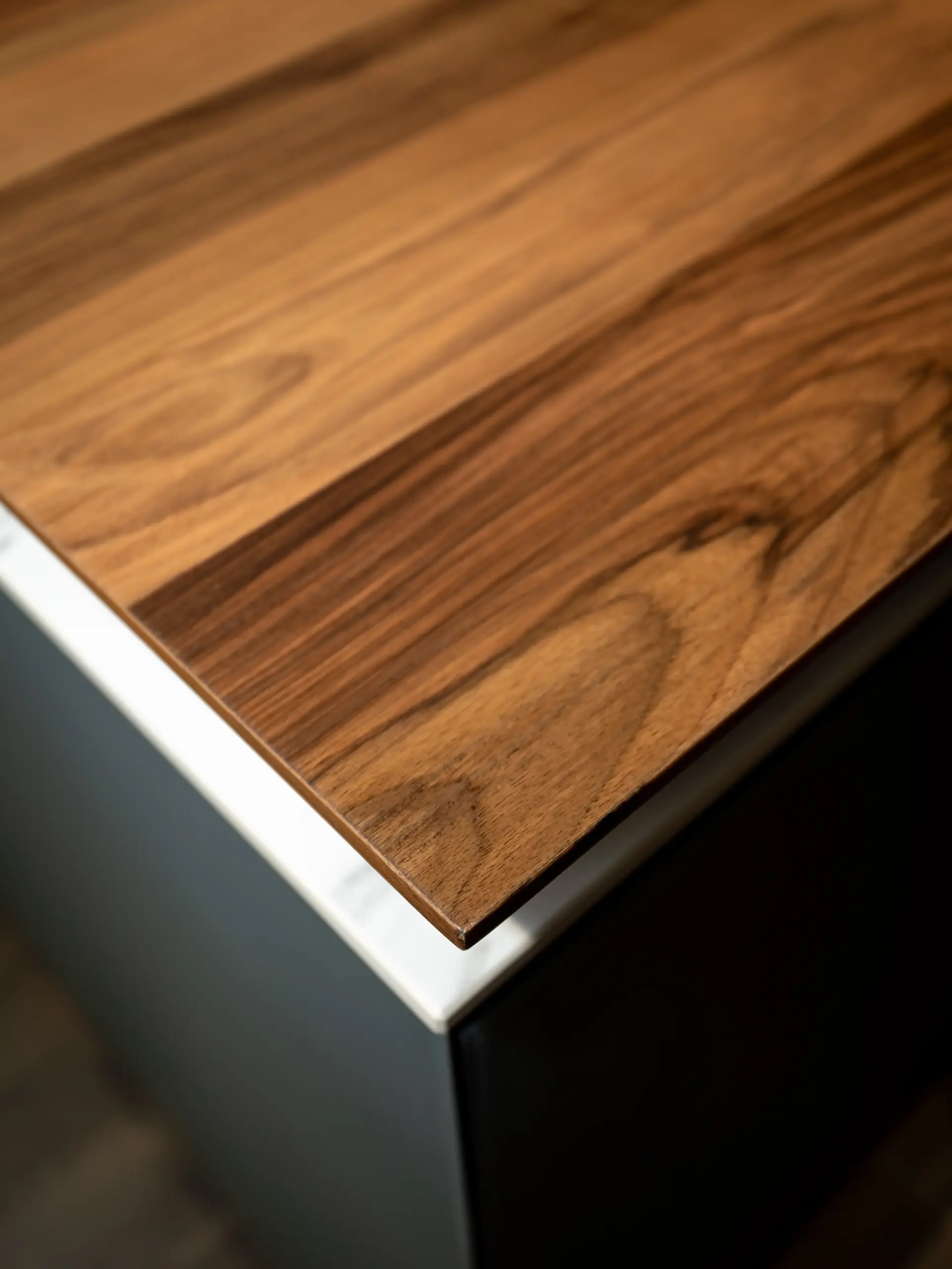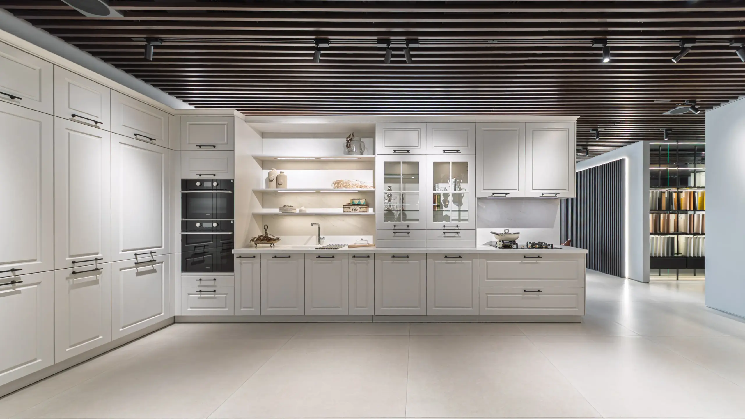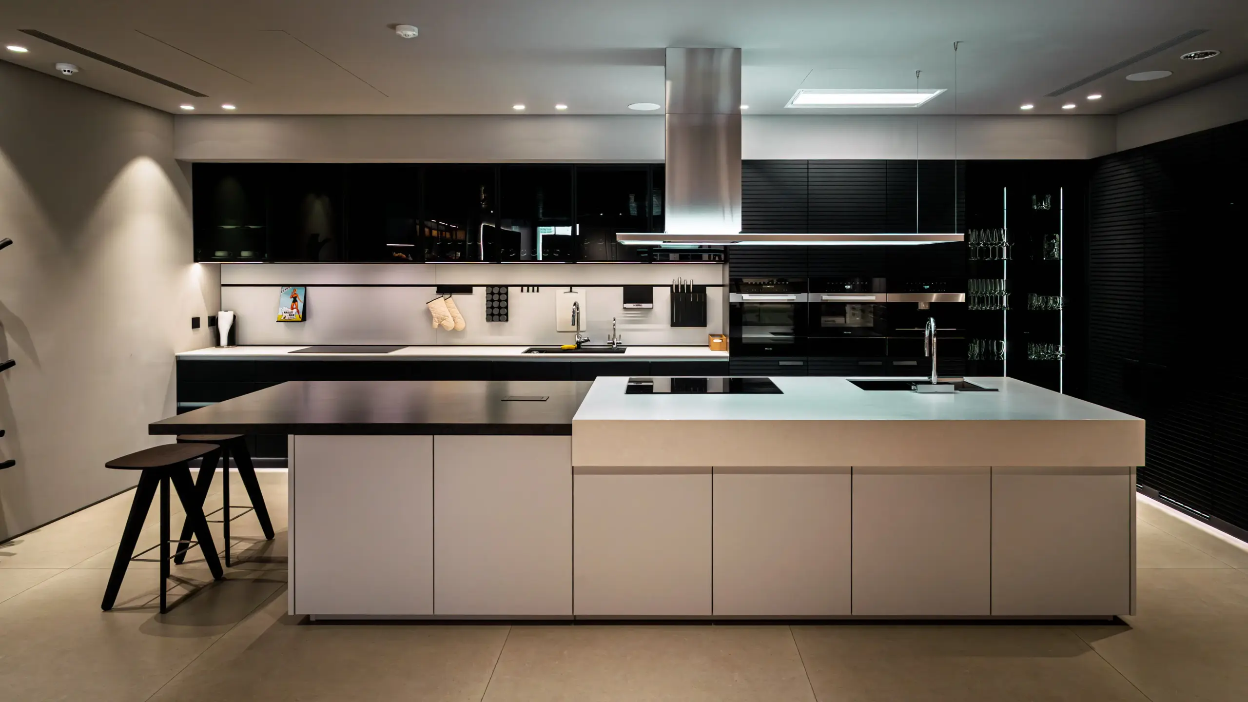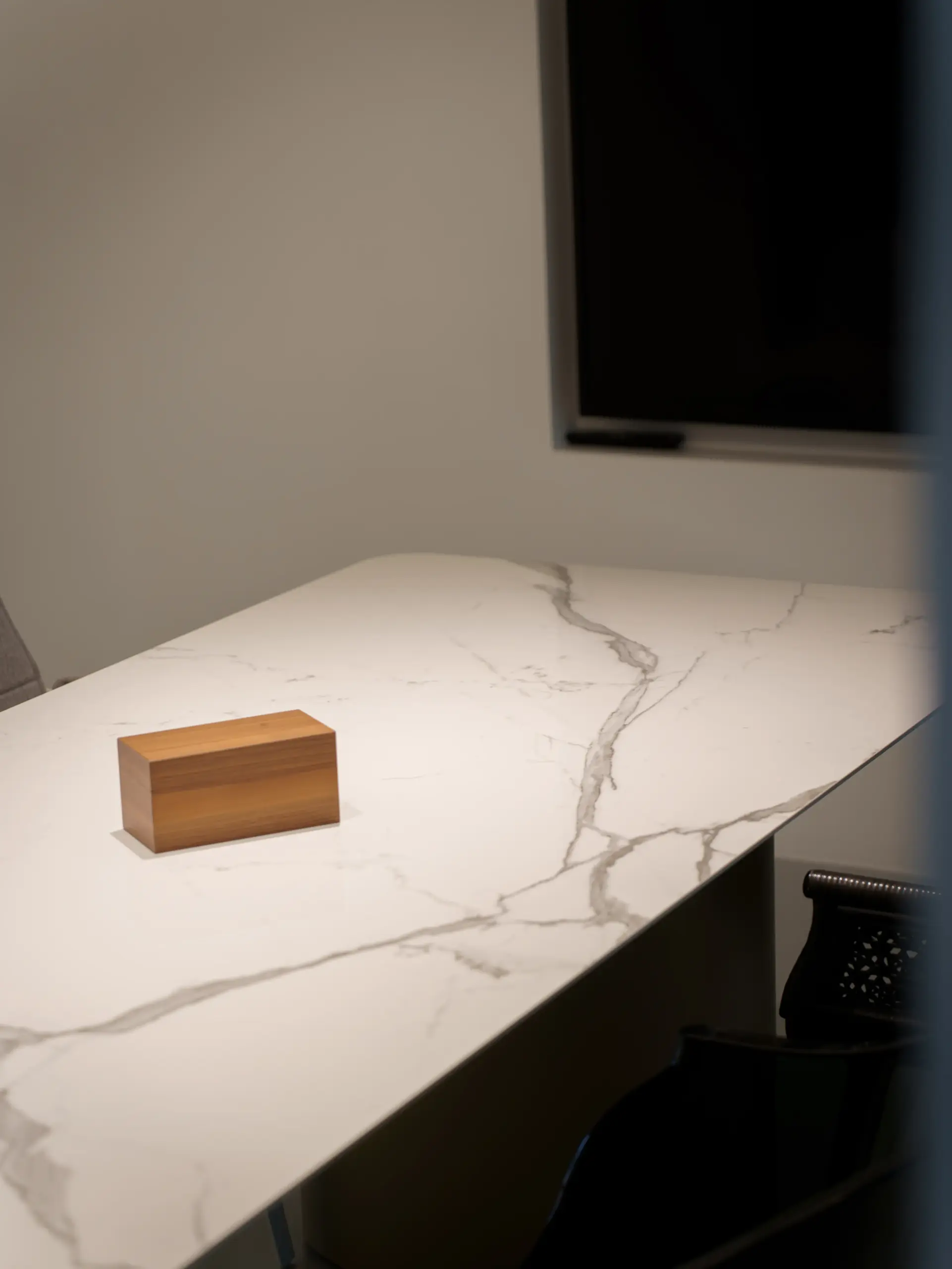 門市展間使用Vicostone會議桌與廚房、中島檯面